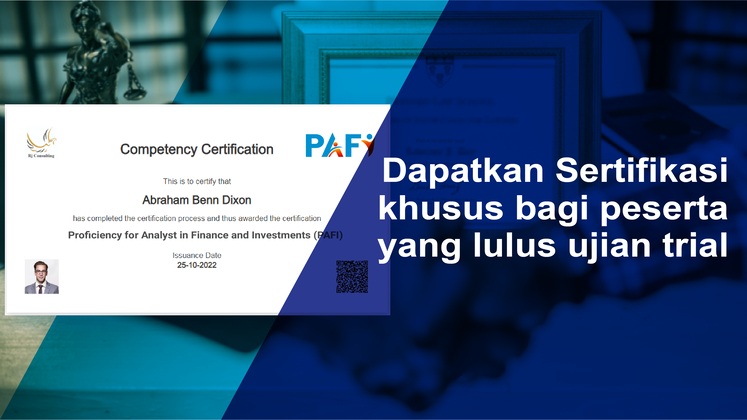 Peserta berhak mengikuti ujian persiapan secara GRATIS, dan akan memperoleh setifikasi non gelar PAFI (Proficiency for Analyst in Finance and Investments (PAFI))