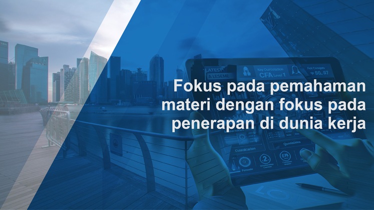 Pelatihan CFA Level 1 kami didesain untuk membantu Anda belajar ilmu analisa keuangan sesuai kurikulum CFA terbaru dengan fokus pada penerapan dalam pekerjaan Anda. Pelatihan ini diselenggarakan secara singkat, dengan total 40 jam belajar saja, sehingga sesuai bagi Anda yang sibuk tidak punya banyak waktu untuk belajar, namun ingin update dengan pengetahuan dan pemahaman terkini yang dipadukan dengan aplikasi nyata berbasiskan AI.